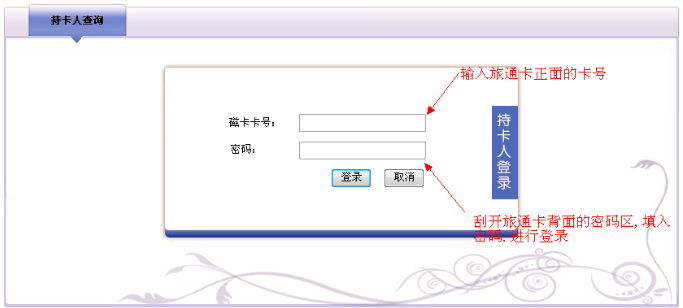 1 输入旅通卡正面的卡号和旅通卡背面的密码区的密码,进行登录,没有密码的旅通卡不支持.